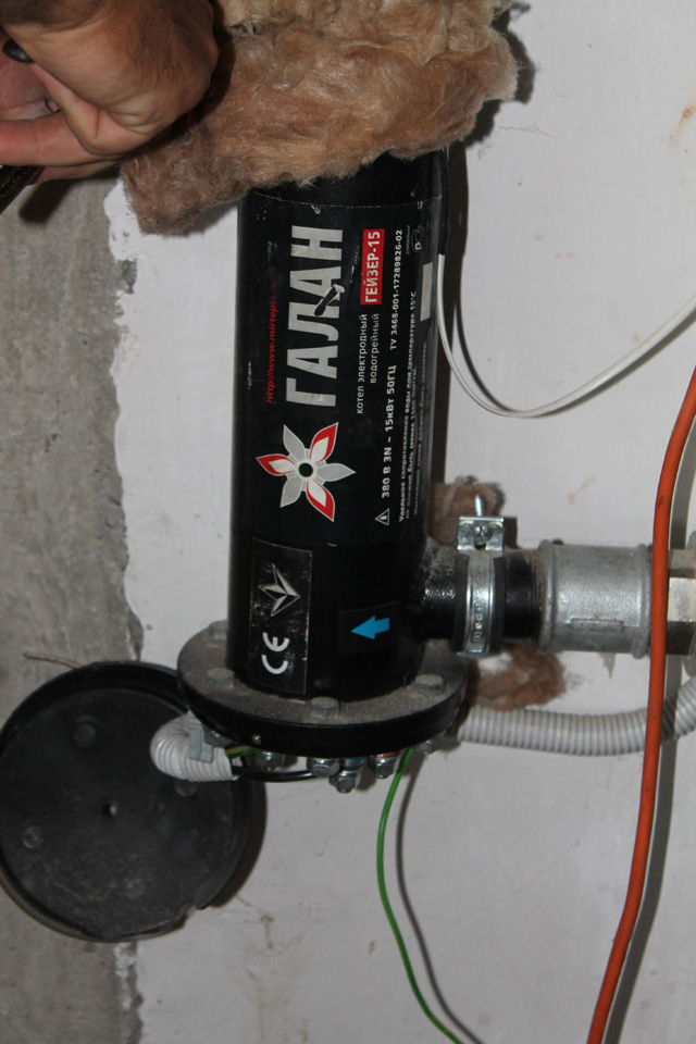 A pincébe érve szembesültünk azzal, hogy a rendszerben egy GALAN típusú orosz elektródás kazán dübörög, a cirill betűs márkanév jól kivehető a fotókon is. Továbbá CE minősítése is van az ionkazánunknak, sőt a minőséget tanúsító intézet megnevezése is fel van tüntetve. Látszólag minden rendben van, külsőre egy biztonságos, forgalomba hozható eszköz van a falra telepítve.