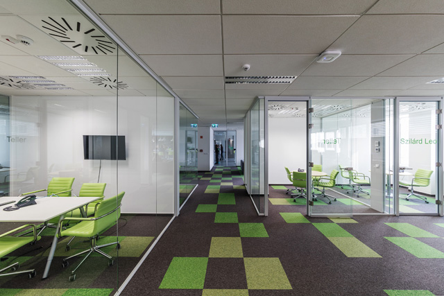 Az egész emeleten kiemelt szerepet kaptak a tágas és világos terek, a természetes fény használata. A tárgyalókban a levegőminőség-érzékelők mérik a szén-dioxid-szintet és a páratartalmat, így szükség esetén a klíma átforgatásával biztosítanak felfrissülést. Hétvége vagy éjszakai üzemmód is beállítható a teljes szintre a referenciatárgyalóban elhelyezett érintőképernyős kijelzőegységen, ami tulajdonképpen az egész rendszer központi agya: ilyenkor minden világítás lekapcsol, a termosztátok 18 fokra állnak, és a redőnyök is a megfelelő helyzetbe kerülnek. Mindez távolról, egy laptop vagy egy okostelefon segítségével is irányítható.
