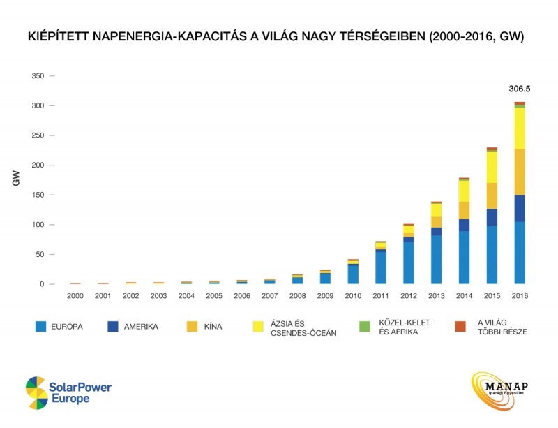 A SolarPower Europe napenergia szövetség éves jelentése szerint 2016-ban összesen 76,6 GW új napenergia-kapacitás épült ki a világon, ami 50 százalékos növekedést jelent az előző évi új telepítésekhez képest, ezzel első alkalommal előzte meg a szélenergia újonnan telepített kapacitásait. A legtöbb kapacitást 2016-ban már Kína építette ki, ami a tavalyi globális fejlesztések 45 százalékát jelentette. Így az ázsiai országban a világ kapacitásainak ma már közel negyede működik.