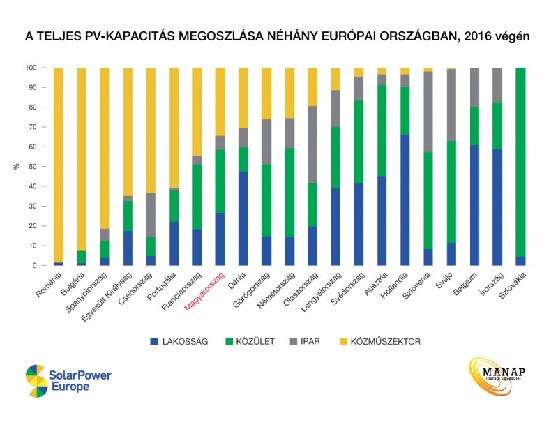 A szektorba áramló befektetések csökkentek: tavaly 23 százalékkal kevesebb tőke érkezett 2015-höz képest. A napenergia-kapacitások bővítése ugyanis jelentősen függ a kormányzati stratégiák változásától. Az elmúlt években Japán például élen járt a fejlesztésekben, de 2016-ban megváltozott az állami energiapolitika, és az állami beruházások inkább a szén- és atomerőművek fejlesztése irányába mozdultak el. Hasonló a helyzet Nagy-Britanniában is, a kormány ugyanis leállította jelentősnek mondható napenergia-programját, így a telepített kapacitások tekintetében az Egyesült Királyság negyedik helyét átvette India, ahol erőltetett fejlesztések indultak, hogy az ország az egyre növekvő villamosenergia-szükségletét megújuló energia hasznosításával elégítse ki. Ázsia második legnépesebb országában a telepített napelemek 90%-a naperőmű, a lakossági és közületi felhasználók által telepített kapacitás elhanyagolható. Magyarország nagyjából kiegyenlített volt 2016 végén a kiépített kapacitás tekintetében: az energiaszektor, a lakosság és a közületek nagyjából egyharmados arányt képviselnek, míg az ipar részaránya sokkal kisebb.