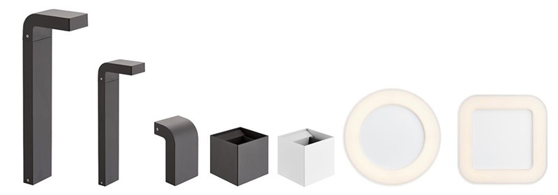 A falra szerelhető öntött alumínium házas kocka alakú lámpatestek felfelé és lefelé irányuló fényt adnak, ugyanakkor állítható a sugárzási szögük is. Fekete és fehér színben kaphatók, szintén IP54-es besorolással és 3000 K meleg fehér színhőmérséklettel.