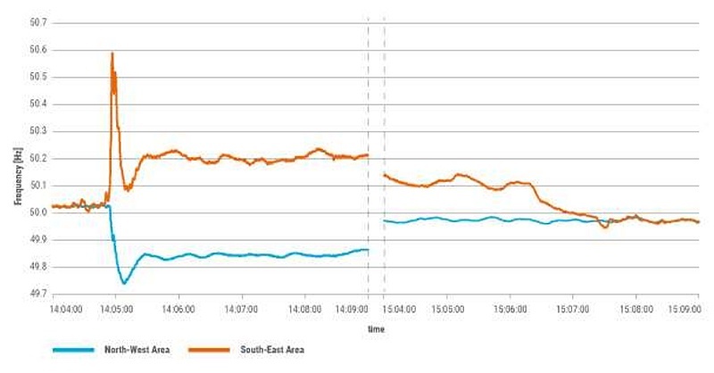 Közép-európai idő szerint körülbelül 14:05-kor a kontinentális Európa észak-nyugati térségében a frekvencia kb. 15 másodperc alatt kezdetben 49,74 Hz értékre esett le. Ezt követően a frekvencia elérte a körülbelül 49,84 Hz állandósult állapotú értéket. Ugyanakkor a délkeleti térségben a frekvencia kezdetben 50,6 Hz értékre nőtt, mielőtt beállt 50,2 Hz és 50,3 Hz közötti állandósult állapotú frekvenciára. Ez az alábbi grafikonból is látható.