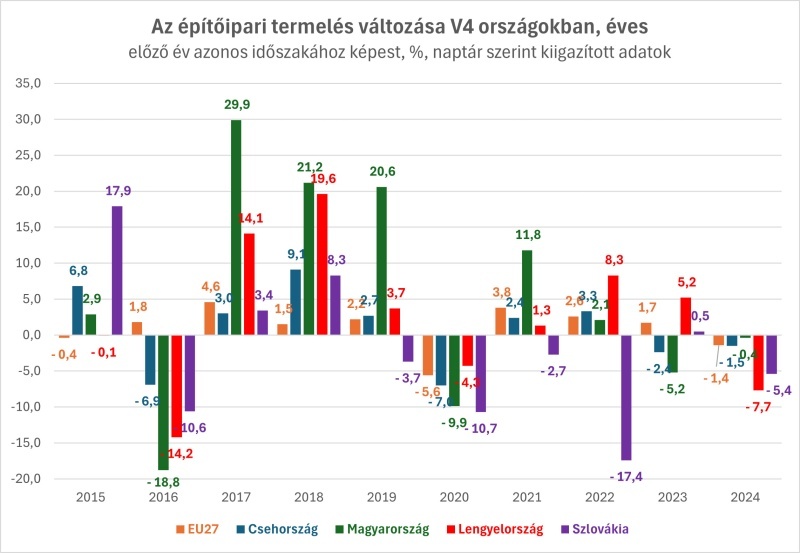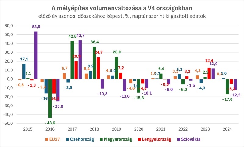 A mélyépítési ágazatot nagymértékű ingadozás jellemzi, különösen Magyarországon (2015-ben 53,5%-os növekedés, majd jelentős visszaesések) és Szlovákiában (2017-ben 43,7%). Csehország viszonylag stabilabb teljesítményt nyújtott. 2024-ben minden visegrádi országban negatív vagy stagnáló volt a teljesítmény (5. ábra).