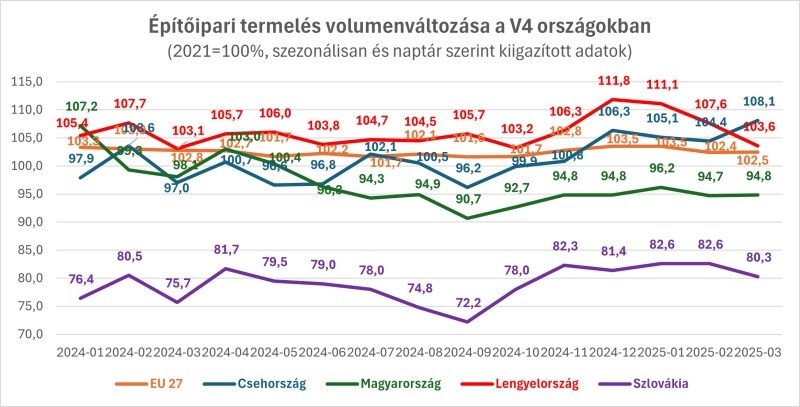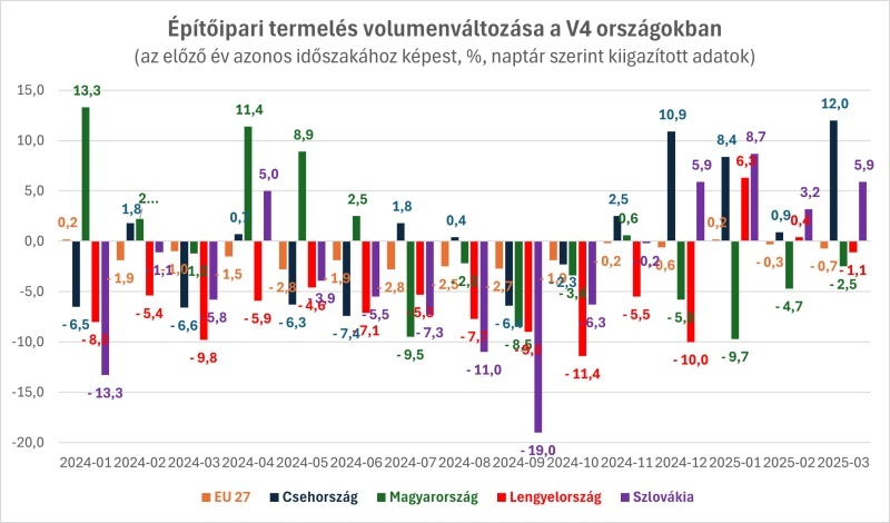 A legfrissebb, 2025 eleji adatok is vegyesek: Csehország és Szlovákia építőipari termelése kezd némi élénkülést mutatni, míg Magyarország, Lengyelország, és az uniós átlag továbbra is visszaesésben van.