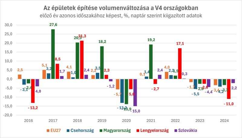 Az épületek építése (4. ábra) területén hasonlóan az általános trendhez, erős növekedés után (2017-ben 27,6%-os magyar csúcs) meredek visszaesés jellemezte a V4 országokat 2020-ban és 2023-ban is. 2024-ben minden visegrádi ország visszaesést mutatott, Lengyelország a legnagyobbat (-11,0%). Az európai átlag ebben a szektorban is stabilabb volt, bár 2024-ben már ott is csökkent a volumen.