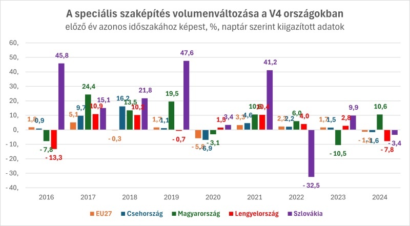 A speciális szaképítés területe szintén produkált kilengéseket a térségben, mely az utóbbi két évben valamelyest enyhült. Szlovákia mutatta a legnagyobb ingadozást (2019-ben 47,6%, majd meredek esés). Magyarországon is nagyon változékony volt, de 2024-ben egyedüliként mutatott jelentős pozitív növekedést (+10,6%), míg a többi visegrádi ország és az EU átlag negatív tartományban volt. Csehország 2019 óta stabilabb, Lengyelország 2021 óta lassul (6. ábra). Az EU27 átlaga esetében jóval kisebbek voltak a kilengések. 2021 óta enyhén, de folyamatosan csökken a speciális szaképítés volumenének növekedése, és 2024-ben valamelyest vissza is esett.