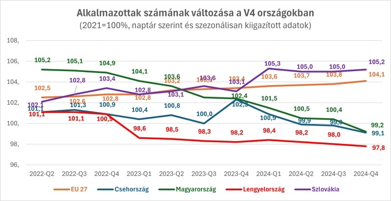 2021-hez képest a visegrádi országok többségében csökkent az alkalmazottak száma (7. ábra). A V4 országok többsége alul teljesít az uniós átlaghoz képest. Lengyelország 2022 negyedik negyedéve óta, Csehország 2024 második negyedéve óta a 2021-es szint alatt van. Magyarországon volt a legnagyobb a csökkenés a teljes vizsgált időszakban. Szlovákia és az EU átlag mutatott lassú, fokozatos növekedést a vizsgált időszakban.