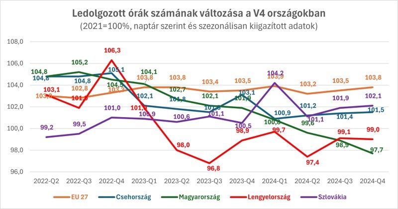 A ledolgozott órák számát tekintve az EU27 átlag lényegében stagnált, de a 2021-es szint felett maradt (~+3%). Ezzel szemben Magyarországon és Lengyelországban a ledolgozott órák száma a 2021-es szint alá esett vissza, Magyarországon a legmeredekebb eséssel. Csehország is csökkenő tendenciát mutatott, de a 2021-es szint felett maradtak, Szlovákiában bár kilengésekkel – de a trend javulást jelez. Összességében a visegrádi országok elmaradnak az uniós átlagtól (8. ábra).