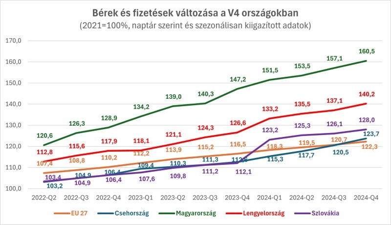 Mind a visegrádi országokban, mind az EU27-ben jelentős bérnövekedés történt 2021 óta. A régión belül Magyarországon volt a legnagyobb a bérnövekedés 2021-hez képest. Lengyelországban szintén erős volt, de elmaradt a hazaitól, a szlovák és a cseh bérnövekedés pedig az uniós átlagot követte (9. ábra).