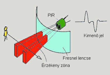 A lencse fel van szeletelve koncentrikus körökre, és az anyag csak a görbületi sugárnak megfelelő részeket tartalmazza, a többi homogén részt nem. Az egész nem más, mint sok kis prizma, melyek egymás mellé vannak helyezve, és ahogy egyre távolabb haladunk a középpontból, úgy nő a prizmák törőszöge. Képalkotása nem a legtökéletesebb, de a mi esetünkben csak sugárzó felületeket kell vizsgálni, erre pedig tökéletes. A lencsék egy-egy adott terület képét vetítik a kristály felületére. Ahány lencse van a tranzisztor előtt, annyi zónára osztja a területet az érzékelő. Mivel a kristály téglalap alakú, emiatt a látható zónák gúla alakot vesznek fel. Az érzékelőtől 8-10m-re eső zónának a nagysága nem éri el az 1m2-t. Ha egy érzékeny gúlába belelépünk, akkor hőváltozást okoztunk, és a kristály kimenetén feszültség keletkezik. Hogy érzékenyebb legyen az eszköz, a legtöbb tranzisztorba két darab kristályt helyeznek el egymás mellé, és fordított polaritással sorba kötik a tokon belül. Ezáltal a kristály sokkal érzékenyebb lesz a mozgásra és a hőkompenzációt is elvégzi. A tranzisztorból kijövő jelet különböző erősítők segítségével felerősítik, majd egy mikroprocesszoros rendszer végzi el a kiértékelést. A kimenet minden esetben relékimenet, mely galvanikusan leválasztja az érzékelőt a külvilágtól.