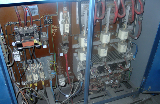 Amikor az összes járművet igénybe veszik, körülbelül 200 A-es áramerősséggel folyik az áram. Ezért 95-ös kábelen szállítják a fémhálóba az áramot, méghozzá egy szabályozó készülékből, amely a 400 V-os, háromfázisú áramból egyenáramot állít elő. Tirisztoros szabályozásról van szó, egy potméterrel lehet közvetlenül beállításokat eszközölni.