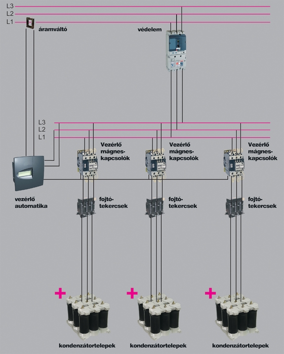 Egy iparvállalt esetében nagyon fontos arra is odafigyelni, hogy a vételezett meddő-energia ne haladja meg azt a néhány %-os értéket, amelyet az adott terület áramszolgáltatója megenged. Egy gyártási folyamat során rengeteg motoros alkalmazás kerül felhasználásra, márpedig a motorokat működtető mágneses tér létrehozásához szükséges a meddőenergia: ezért azt kompenzálni kell. Erre egy irodaháznak is érdemes terveket készítnie, mert a rengeteg nem lineáris fogyasztó is okozhat meddő-veszteséget. A kompenzálásra ma már professzionális megoldások léteznek, akár egy komplett szekrényben (2. ábra), akár összeállított készülékekből álló rendszerek (3. ábra).