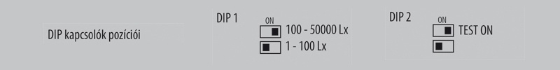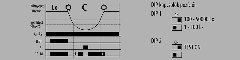 A kapcsolt fogyasztók ellenőrzésére gyakran találhatunk egy TEST kapcsolót, mely bekapcsolásának időtartamára a kimeneti relé is zárva van a fényviszonyoktól függetlenül.