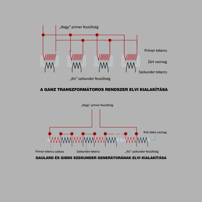 Gaulard és Gibbs berendezését kiállították egy torinoi kiállításon, melyen a Ganzból részt vett az akkor huszonöt éves Bláthy Ottó Titusz. Azzal tért haza, hogy nekik ennél jobb megoldást kell találniuk. Helyesen ismerte fel, hogy a megoldás kulcsa a vasmag megfelelő kialakítása. A nyitott, rúd alakú vasmag mágneses erővonalai a levegőn keresztül záródnak. Bláthy az indukció elméleti törvényszerűségeinek végiggondolása során rájött, hogy sokkal kedvezőbb zárt vasmagot alkalmazni. Gyorsan cselekedtek. Elkészítették a mintadarabot, melyen a próbákat és ellenőrző méréseket Déri Miksa végezte el. A villamos energia elosztását az új berendezések párhuzamos kapcsolásával tervezték.