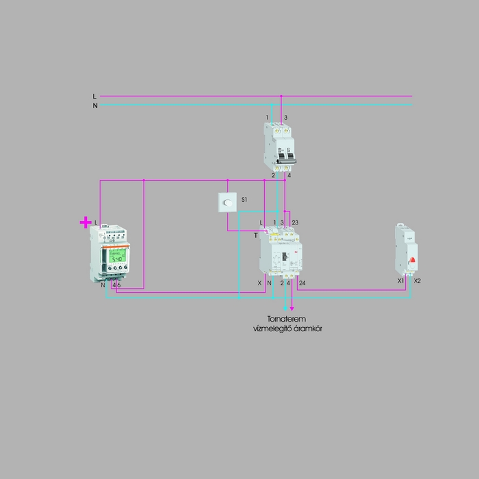 Legyen a feladat egy közintézmény melegvíz előállító készülékének időzítése. Nyilvánvaló, hogy a nap és a hét minden percében nem kell, hogy a melegvíz rendelkezésre álljon, hiszen egy közintézményt éjszaka és a hétvégén a legritkább esetekben használnak. A megoldás megvalósításához szükségünk van egy mágneskapcsolóra a terhelés vezéréléséhez (ki-, bekapcsolás), illetve ennek az oldalára szerelt segédkontaktusra és egy időzítő programozható órára. Ebben az alkalmazásban lehetőség van normális programozott működésre. Abban az esetben, ha mégis a normál beállítási időintervallumokon kívül más időszakban is igénybe akarják venni az intézményt, akkor a nyomógomb megnyomásával bármikor előállítható melegvíz, lényegében a programóra megkerülésével. Ha vissza szeretnénk térni a normál időzítéses működésre, akkor ismét meg kell nyomni a gombot és máris visszaáll a programóra rendszere: az eredeti programozás szerint fogjuk a vizet melegíteni. A beépített LED jelzőlámpa pedig megmutatja, hogy éppen történik-e vízmelegítés.