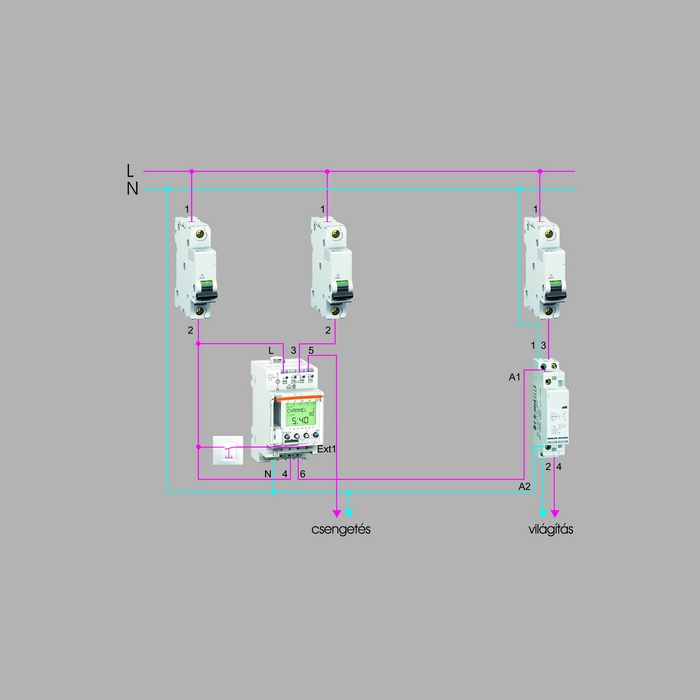 A bekötésből látható, hogy a programóra kezeli a világítás (vagy a melegvíz-kezelés) vezérlését, míg a másik csatornán működtethetjük a csengetést is. Jelen állapotban a nyomógomb segít a világítási áramkör időzítésének megkerülésére és alkalmazásával az időzítésen kívül is fel lehet általa kapcsolni a világítási áramköröket. A tapasztalati eredmények azt mutatják, hogy így akár 50% megtakarítás is elérhető!