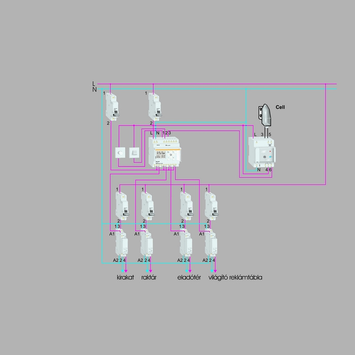 Ebben a példában azt láthatjuk, hogy a különböző helyiségek világításigényét és időzítését különbőzképpen oldjuk meg. Beiktattunk egy fényerősség-érzékelőt is. Látható, hogy az időzítő programóra 4 csatornát menedzsel annak függvényében, hogy a fényerősség-érzékelő milyen fényességet mér. A kirakat világítása függ a programóra idő és nap beállításaitól. A raktárt és az eladóteret időzíthetük szintén, de nyomógombbal felül is bírálhatjuk. A világító reklámtábla pedig a fényerőnek és az időzítésnek megfelelően akkor kapcsol be, amikor az a legoptimálisabb. Összességében akár 25%-nyi energia-megtakarítás is elérhető ezen a módon.