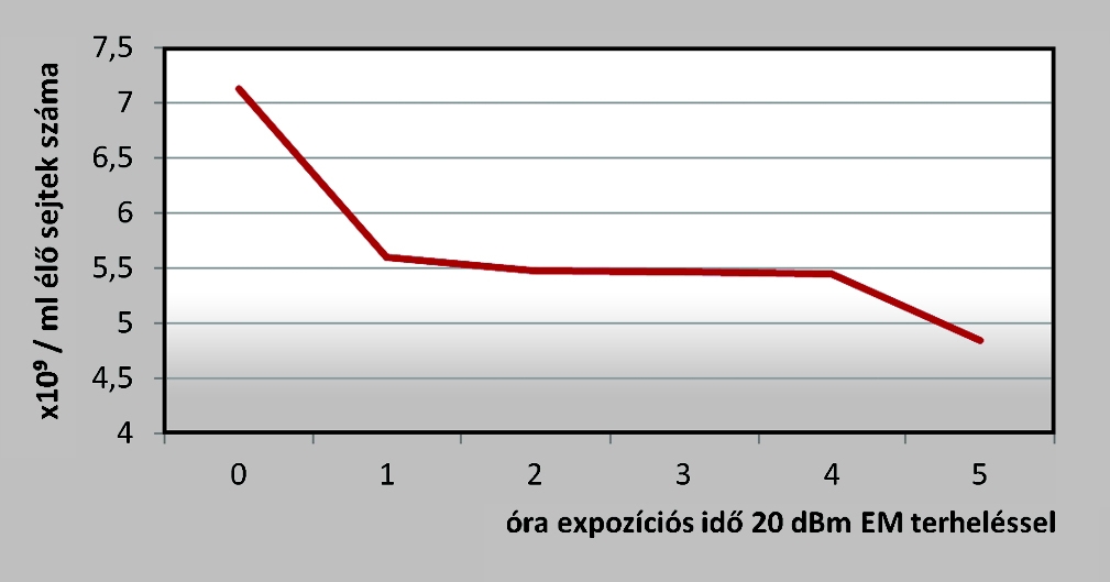 | 1. ábra: EMF-terhelés alatt az idő függvényében jelentősen csökken az élő sejtek száma. |