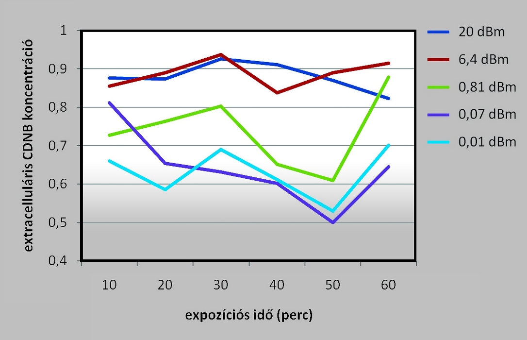 A korábbi elrendezést követve, az EMF-forrástól különböző távolságokra, tehát eltérő sugárterhelés alatt expontáltuk a sejteket, majd egy órán keresztül 10 percenként mintát vettünk belőlük. A mintákból elhaltsejt-számlálást végeztünk, valamint leválasztottuk a sejtmentes mátrixot 5 perc 9000 rpm centrifugálással. A sejtmentes mátrixból fotometriás úton (340 nm) határoztuk meg a CDNB relatív koncentrációját. Az adatokat a sejtszám alapján kompenzáltuk (2. ábra).