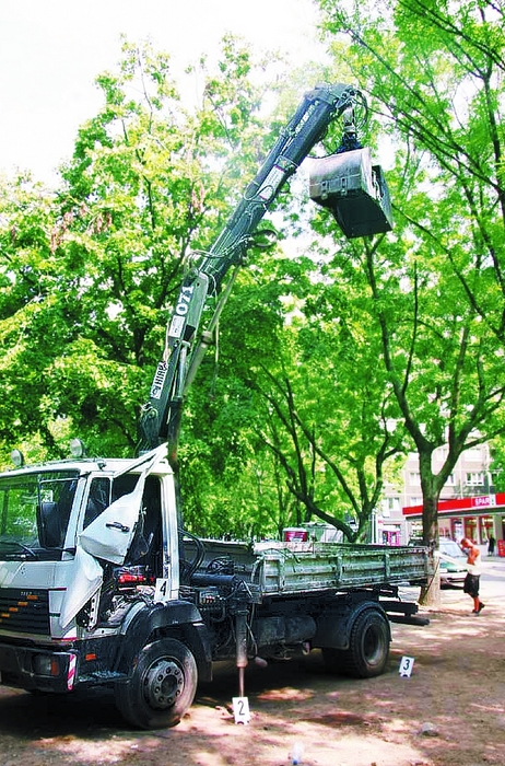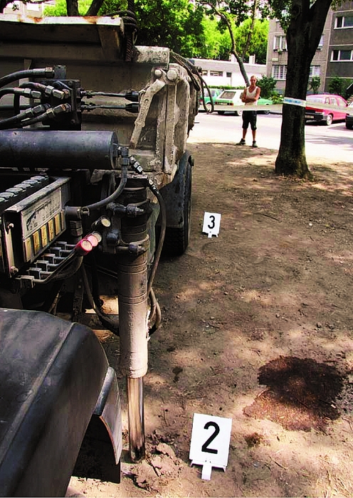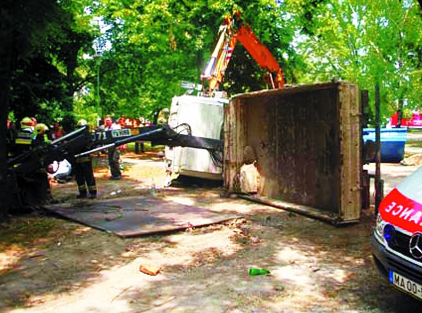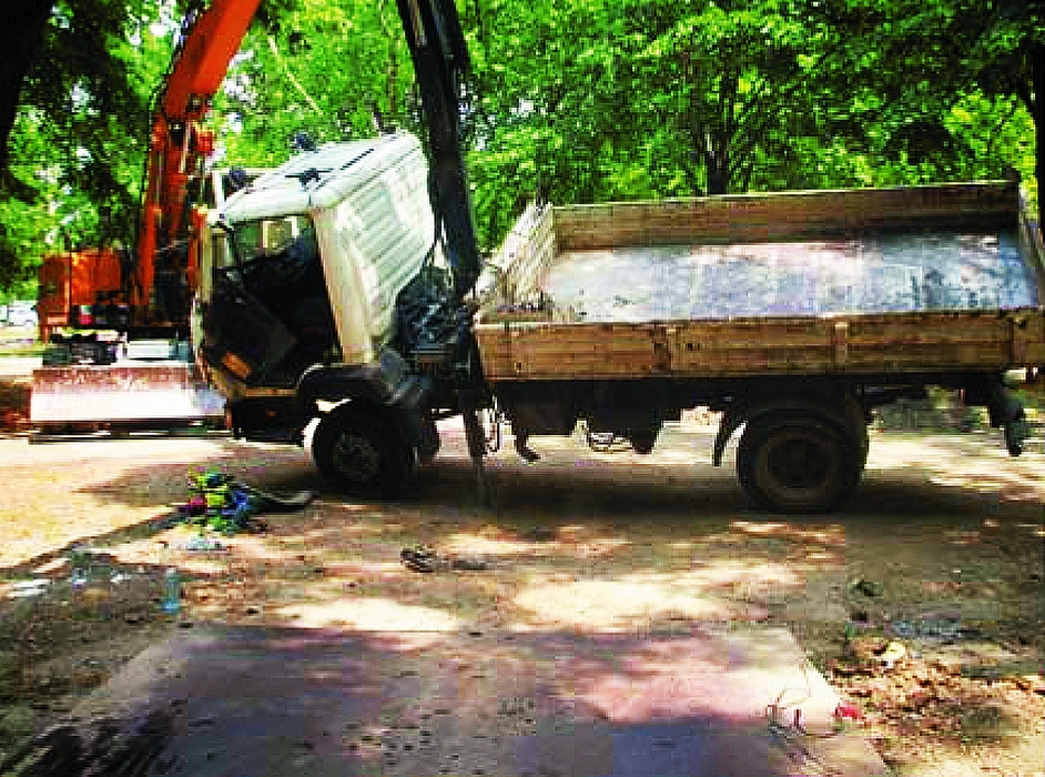 A horgokkal rögzítette az acéllapot, majd megkezdte az emelést. A teherautó a lemez súlya, valamint a balra elengedett darugém miatt a kitámasztás hiányában a bal oldalára fordult, a vezetőfülke bal oldali ajtaja kinyílt, azt a gépkocsi súlya felgyűrte, majd a billenő autó a jármű bal oldalán álló kezelőt maga alá temette. Az OMMF Közép-magyarországi Munkavédelmi Felügyelőség által közvetlenül a baleset után megtartott helyszíni ügyfél-meghallgatási jegyzőkönyvében T. F., az N. Kft. tulajdonosa és ügyvezetője az alábbiakat nyilatkozta: „Az emelési feladatot B. T. egyedül, rutinszerűen oldotta meg. Az autóval a vaslemez mellé állt, ahol volt hely bőven. A kitalpalás a kötél beakasztása előtt szükséges. A kisteherautó bal oldali (emelőoldali) talpát engedte ki, és megkezdte a vaslemez emelését. Mivel a bal oldali talp alá nem helyezett támasztófát – a talajt megfelelően szilárdnak ítélte –, az autó felborult, és B. T. a fülke alá szorult... B. T. az oldaltámaszt nem tolta ki, és a helyszínen nem volt egyetlen alátétfa sem.”