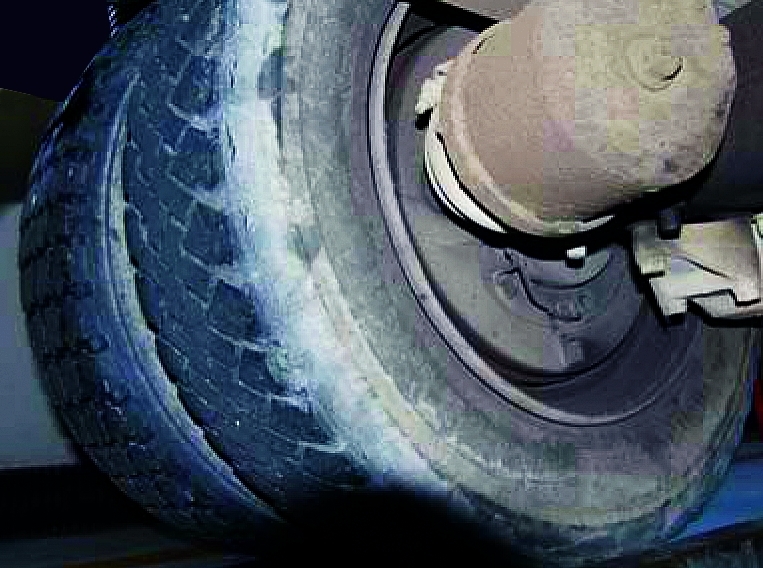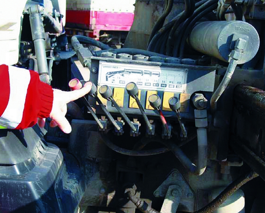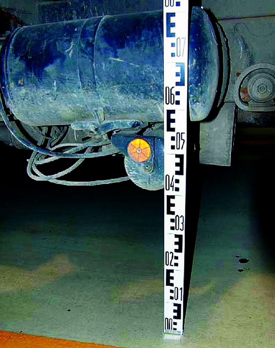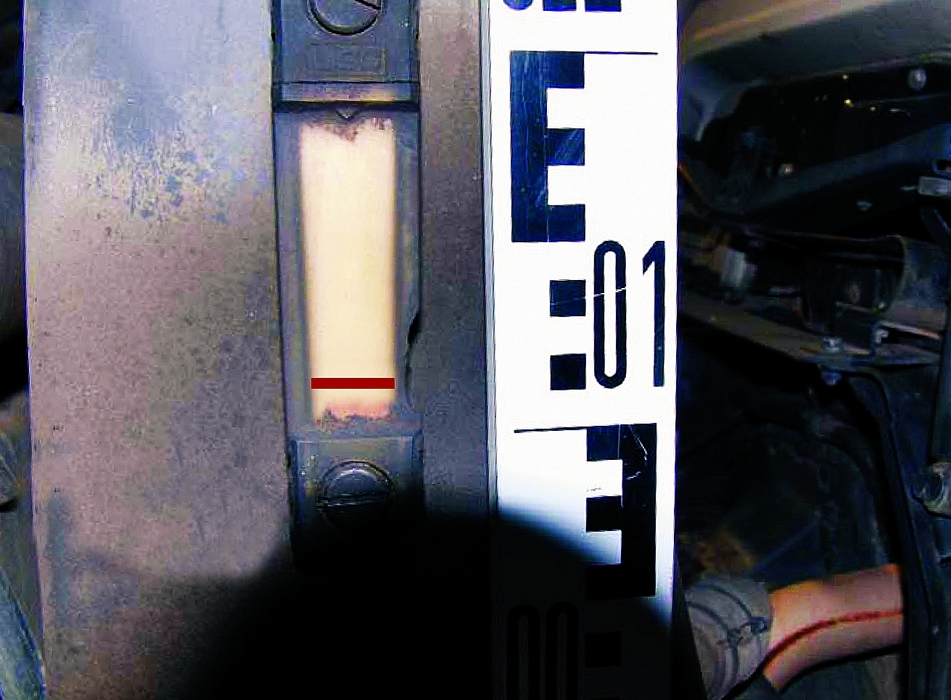 | 17. ábra: A gumiabroncsok vizsgálata | 18. ábra: A hidraulika tartály telítettségjelzője. A piros vonal az olajszintet jelöli. A letalpaló szerkezet kettő szerkezeti elemből tevődik össze. Az egyik az úgynevezett kitalpaló gerenda: ez vízszintes irányban kézi erővel mozgatható. A másik a függőleges letalpaló szerkezet, amely hidraulikus működtetésű. A letalpaló szerkezet megfelelő működését a szakértői vizsgálat igazolta. |