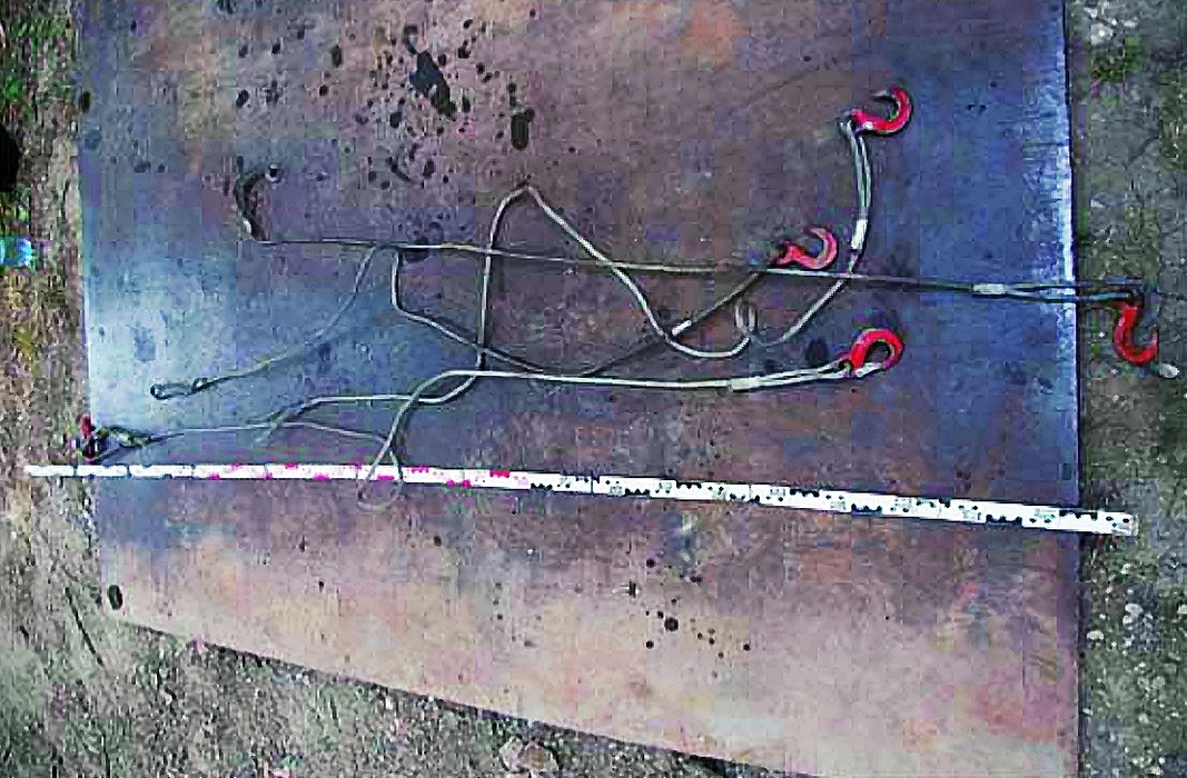 | 14. ábra: A tehergépkocsi bal oldali ajtajának maradandó deformációi | 15-16. ábra: Az emeléshez használt acélsodrony kötelek fényképfelvételei |
