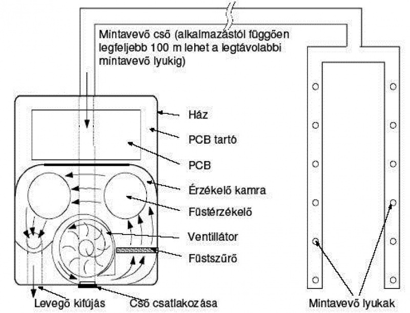 A levegő egy csőhálózatból érkezik, mely a védett térben helyezkedik el. A csőhálózatot hosszúságra és átmérőre gyártói ajánlások alapján mé-retezni kell. A mintavevő pontok elhelyezését pontosan szabályozza az OTSZ. Ezen típusú érzékelő nagy előnye, hogy elrejthető, így ideális megoldás múzeumok esetében, hátránya, hogy a tűz pontos helyét nem lehet lokalizálni. A legújabb fejlesztéseknek köszönhetően a tűz detektálása már kamerákkal is megoldható, ami szoftver segítségével valósulhat meg.