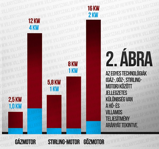 Hőkörfolyamat alapú kapcsolt termelésnél a gépben keletkező hő arányos a generátorban termelt villamos energiával. Vannak olyan berendezések, melyek csak a névleges teljesítménnyel járathatók. Itt a hő- és villamos teljesítmény aránya egy adott érték. Gyártanak részterheléssel is üzemeltethető egységeket is. Részterhelésen a hatásfok valamelyest csökken, a villamos hatásfok romlása a jelentősebb. A két érték aránya azonban itt is közel állandó. Nincs szükség, illetve lehetőség külön a villamos teljesítmény meghatározására, az egyik meghatározza a másikat. A hő- és villamos teljesítmény arányában azonban nagy különbség van attól függően, hogy mi hajtja meg a generátort (2. ábra). Egységnyi tüzelőanyagból a gázmotoros gépek állítják elő a legtöbb villamos energiát. A Stirling- és gőzmotoros gépeknél a villamos energia részaránya kisebb. (Az üzemanyagcellás technológia monovalens üzemre nem alkalmas.)