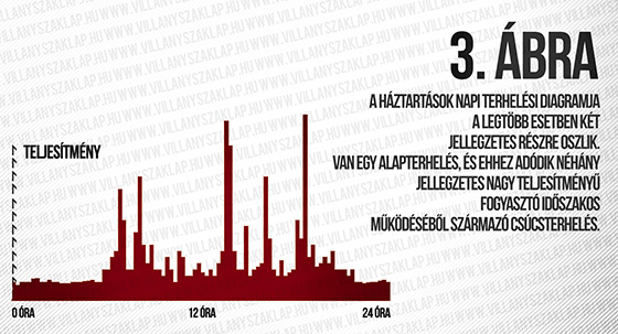 A háztartások napi terhelési diagramja a legtöbb esetben két jellegzetes részre oszlik. Van egy alapterhelés, és ehhez adódik néhány jellegzetes nagy teljesítményű fogyasztó időszakos működéséből származó csúcsterhelés (3. ábra). Az alapterheléses időszakok sokkal hosszabbak, mint a csúcsterheléses időszakok. Ebből következik, hogy a fogyasztás döntő része kis teljesítmény mellett történik. Kisebb az a hányad, ami a nagy teljesítményhez köthető. Az alapterhelés a legtöbb háztartásánál annyira kicsi, hogy egy 1 kW-os villamos teljesítményű gép is elégséges. Ez tükröződik is abban, hogy a piacon sok gép található 1 kW-os villamos teljesítménnyel. Ezek között vannak még ennél kisebb részterheléssel is járatható típusok is. Egy 1 kW-os gép a legtöbb háztartásban képes az alapterhelést fedezni. Ha a gép ennél nagyobb teljesítményű, több áramot termel, de nem vált ki lényegesen több beszerzést. A villamos fogyasztási csúcsok rövid ideig tartanak, a nagyobb teljesítmény előnye csak e rövid időszakokban érvényesül. Ott, ahol az átlagostól eltérő a villamosenergia-fogyasztás, ajánlott részletes felmérést és elemzést végezni. Ilyen esetben érdemes ehhez az igényhez illesztett, nagyobb berendezést választani.