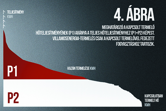 Meghatározó a kapcsolt termelő hőteljesítményének (P1) aránya a teljes hőteljesítményhez (P1+P2) képest (4. ábra). Villamosenergia-termelés csak a kapcsolt termelővel fedezett fogyasztáshoz tartozik. Az arányok helyes megválasztásánál figyelembe kell venni az éves villamos és hőenergiafogyasztás mennyiségét és arányát. Több cég is gyárt 1 kW-os villamos teljesítményű gépeket, melyek hőteljesítménye 3 és 8 kW között van, típusonként eltérően. Ha például egy 5 kW-os egységet veszünk alapul, és a teljes hőigény 12 kW, akkor ezzel a kb. 40 százalékos teljesítményaránnyal az éves hőfogyasztás kb. 70 százaléka kapcsolt termelésből fedezhető.