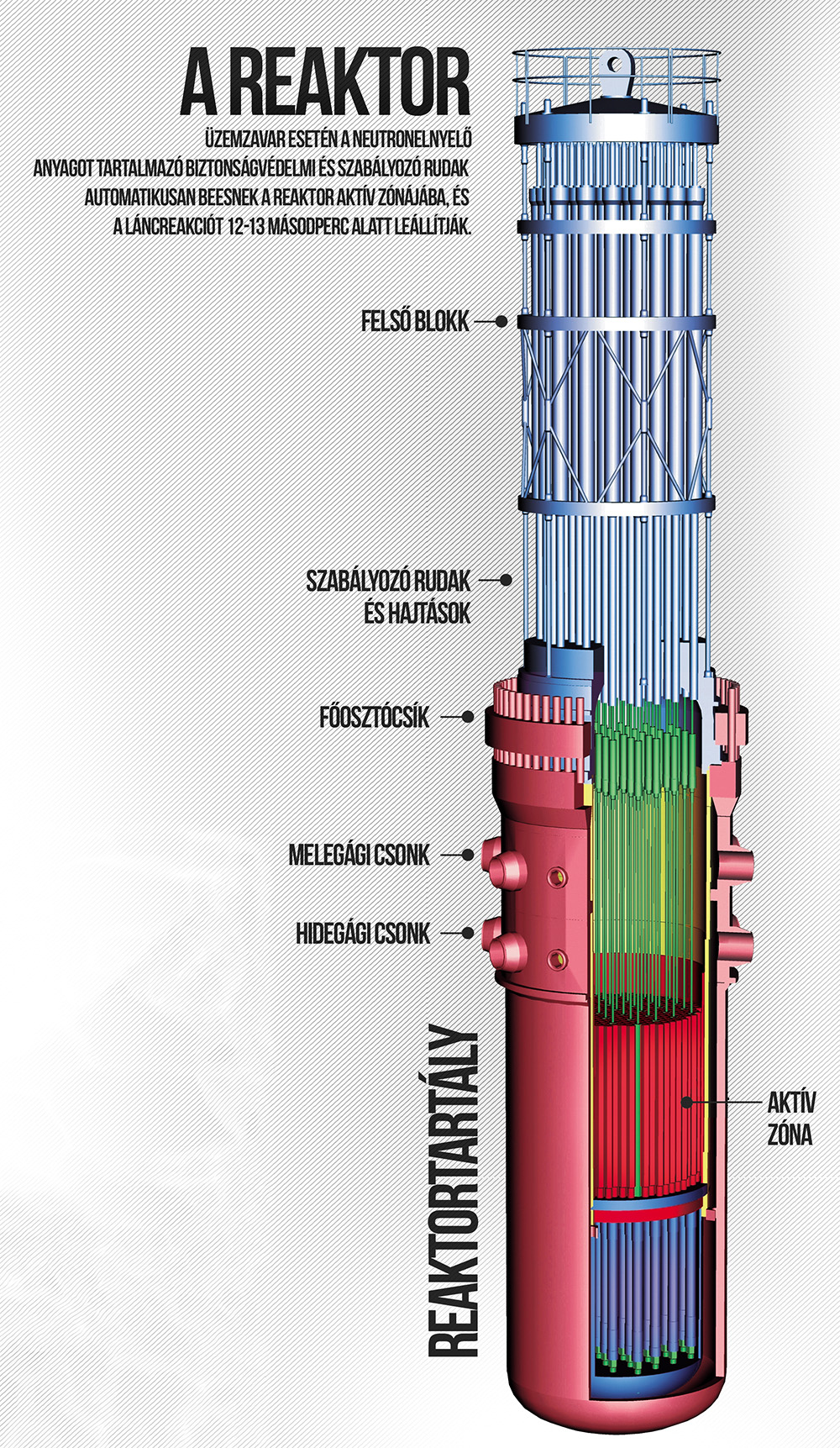 Üzemzavar esetén a neutronelnyelő anyagot tartalmazó biztonságvédelmi és szabályozó rudak automatikusan beesnek a reaktor aktív zónájába, és a láncreakciót 12-13 másodperc alatt leállítják. A reaktorban a maghasadás megszűnése után is jelentős hő fejlődik a hasadványok radioaktív bomlása következtében, amely kezdetben a teljesítmény 7%-át is elérheti. Ugyan a hőfejlődés gyorsan csökken, és egy nap múlva az értéke 1%, 5 nap elteltével pedig csak 0,5%, azonban ennyi hő elegendő lehet a fűtőanyagburkolatok sérüléséhez és a radioaktív anyagok kikerüléséhez, ezért a reaktor hűtéséről a leállás után időszakban is gondoskodni kell.