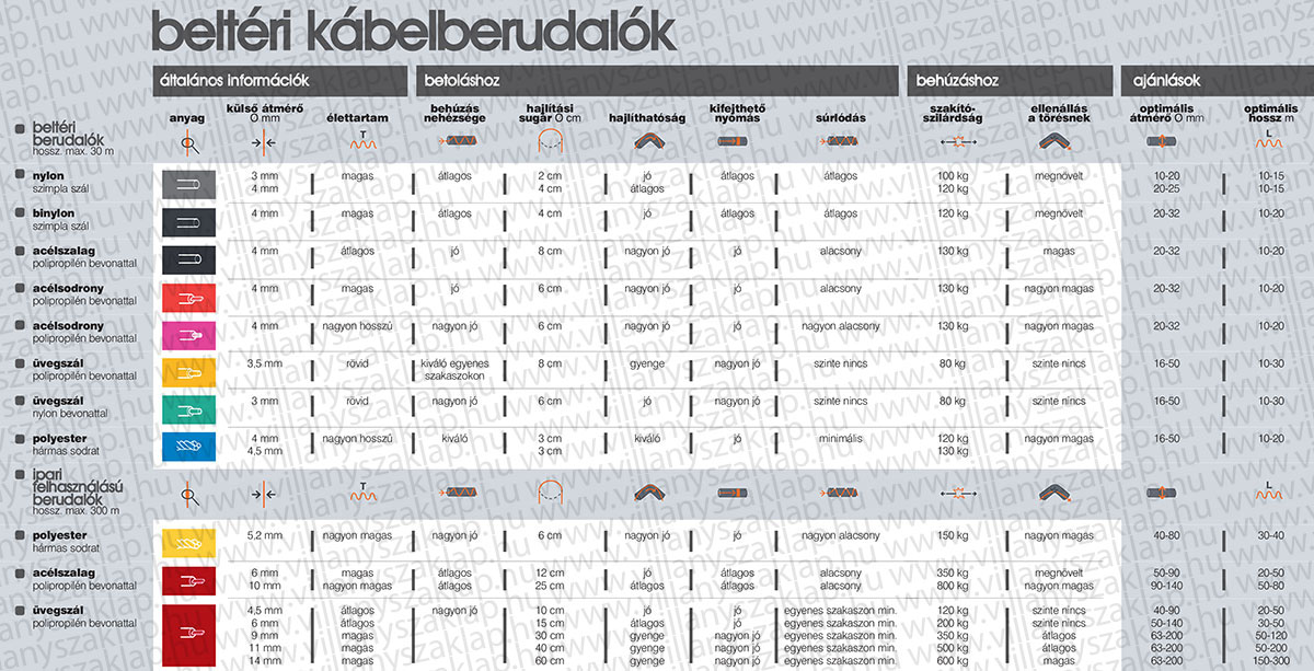 Pl. a polipropilén burkolattal készült acél és üvegszálas típusok alkalmasak a berudalási és behúzási feladatok alkalmával kiemelt igényként fellépő hatékony csúszási jellemzők biztosítására, úgy, hogy közben a megfelelő mechanikai védelmet is biztosítják. Az alaphordozók kedvező betolási jellemzőket és nagy teherbírást, szakítószilárdságot biztosítanak. Acél sodronyokat, szálakat és szalagokat tartalmazó eszközök esetén a polipropilén burkolat kiválóan alkalmas a villamos szigetelés biztosítására is, hangsúlyozva azonban, hogy a végzáróelemek fémszerelvényei mindenkor közvetlen kapcsolatban vannak a berudaló magjával. Ez utóbbi azt jelenti, hogy érintés- és balesetvédelmi szempontból erre figyelmet kell fordítani. A berudaló/behúzó modellek kialakításuktól függő jellemzőit, a teljesség igénye nélkül, az 1. táblázatban láthatjuk. Fontos figyelembe venni, hogy az egyes gyártók által összeállított alapanyagok, modelljellemzők eltérhetnek egymástól, így alapvetően mindenkor a gyártó által meghatározott és garantált módon használhatók az eszközök.