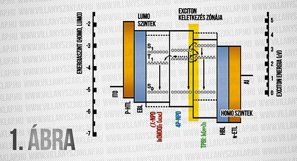 Rövidítések: p-HTL: p adalékolt lyukvezető réteg, EBL: elektronblokkoló réteg, -NPD, Ir(MDQ)2(acac), 4P-NPD, TPBi:Ir(ppy)3: a fényemittáló szerves molekulák rövidített neve, HBL: lyukblokkoló réteg, n-ETL: n adalékolt elektronvezető réteg, S, T a szingulett és triplett állapotok (a példában a foszforeszcens és fluoreszcens rétegek ilyen megoszlása egyedi, más eszközben más választás is lehet, akár csak egyik vagy csak másik típus.)