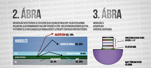 Léteznek külső, a felszínt módosító eljárások: mikrolencsék vagy más, a beesési szöget csökkentő felületi idomok kialakítása. Ezeket öntapadó fóliaként is meg lehet vásárolni. A belső módosítások a szerves rétegben és az ITO anódban vezetett módusok kicsatolását célozzák. A megoldás elve adott, ami káros a planár fény-vezetőkben, az itt pont jó, szabályos vagy szabálytalan akadályokat kell a fény útjába állítani, hogy ne tudjon a rétegben terjedni. Lehet a szerves rétegbe apró szemcséjű szórócentrumokat bekeverni, lehet különböző mintázatokat, hálót kialakítani a belső rétegek között (hullámokat az üveg felületén, rácsot az ITO-ból vagy kis törésmutatójú SiO2-ből), ezek mind jók, és változó költségekkel 50-200%-os hatásfokjavulást lehet elérni. Marad a fém határán terjedő plazmon-csatolt hullám. A több mint egyharmadnyi veszteség megmentése nagyon csábító feladat, de még csak laboratóriumi eredmények vannak. Végül egy egyedi megoldás (3. ábra): tegyük (majdnem) pontszerűvé az OLED-et: szinte olyan lesz mint egy szervetlen LED, így egy félgömb-lencsével 62% kicsatolást lehetett elérni. Ma ez a megoldás a világcsúcstartó a már említett 142 lm/W fényhasznosítással.