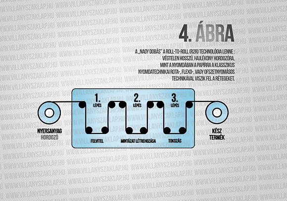 folyatják az oldatot, a szögsebesség, az idő és a viszkozitás határozza meg a rétegvastagságot. „A nagy dobás” a roll-to-roll (R2R) technológia lenne (4. ábra): végtelen hosszú, hajlékony hordozóra, mint a nyomdában a papírra a klasszikus nyomdatechni-kai rota-, flexo-, vagy ofszetnyomásos technikával viszik fel a rétegeket (OLED kijelzőknél, más nyomtatott elektronikai termékeknél természetesen pixeleket, áramköri elemeket nyomtatnak, az igazán nagy nyereség ezeknél látszik). Az első működő sorról már évekkel ezelőtt beszámoltak, de elég keskeny szalagon készült, és piaci termék azóta sincs belőle, főképp azért, mert nagyon drága volt a gyártás. A nehézség a megfelelő időzítés, a szalag csak egy sebességgel haladhat, miközben nagyon különböző időigényű műveleteket végeznek rajta. A másik gond a kihozatal, 70-80% fölé nem si-került menni a kísérleti gyártások során. Sokat dolgoznak a fejlesztésén, mert ebben látják a jelentős költségcsökkentés, a tömeggyártás lehetőségét. A nyomdai lépések közé, ha kell beilleszthető vákuumkamra, ahol a kismolekulájú anyagokat viszik fel, vagy akár félvezető chipeket ültet be a nyomtatott áramköri elemek közé. Mint látható ígéretes technológia, de vagy a kiforratlansága, vagy a válság utáni (alatti?) óvatosság miatt még a legnagyobb cégek sem mertek egy igazi, nagy kapacitású sor beindításába fogni.