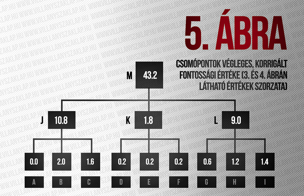 A hálózati koncepció e két szabály alapján a villámimpulzus csatolási folyamatát a betáplálási ponttól a csomópontokat összekötő vonalak mentén a hálózat „belseje” felé haladva egy alkalmas számsorozattal (esetünkben 1 – 0,4 – 0,2 – 0,2 – 0,2 – ...) képezi le (4. ábra). A hálózat csomópontjainak az 5. ábrán feltüntetett végleges, azaz korrigált fontossági értéke a 3. és a 4. ábrán látható számok alapján állítható elő. A csomópontokat az így kapott fontossági értékük szerint sorba rendezve az 1. táblázat tartalmazza, megadva az egyes csomópontok védelméhez rendelt SPD-k költségét is.