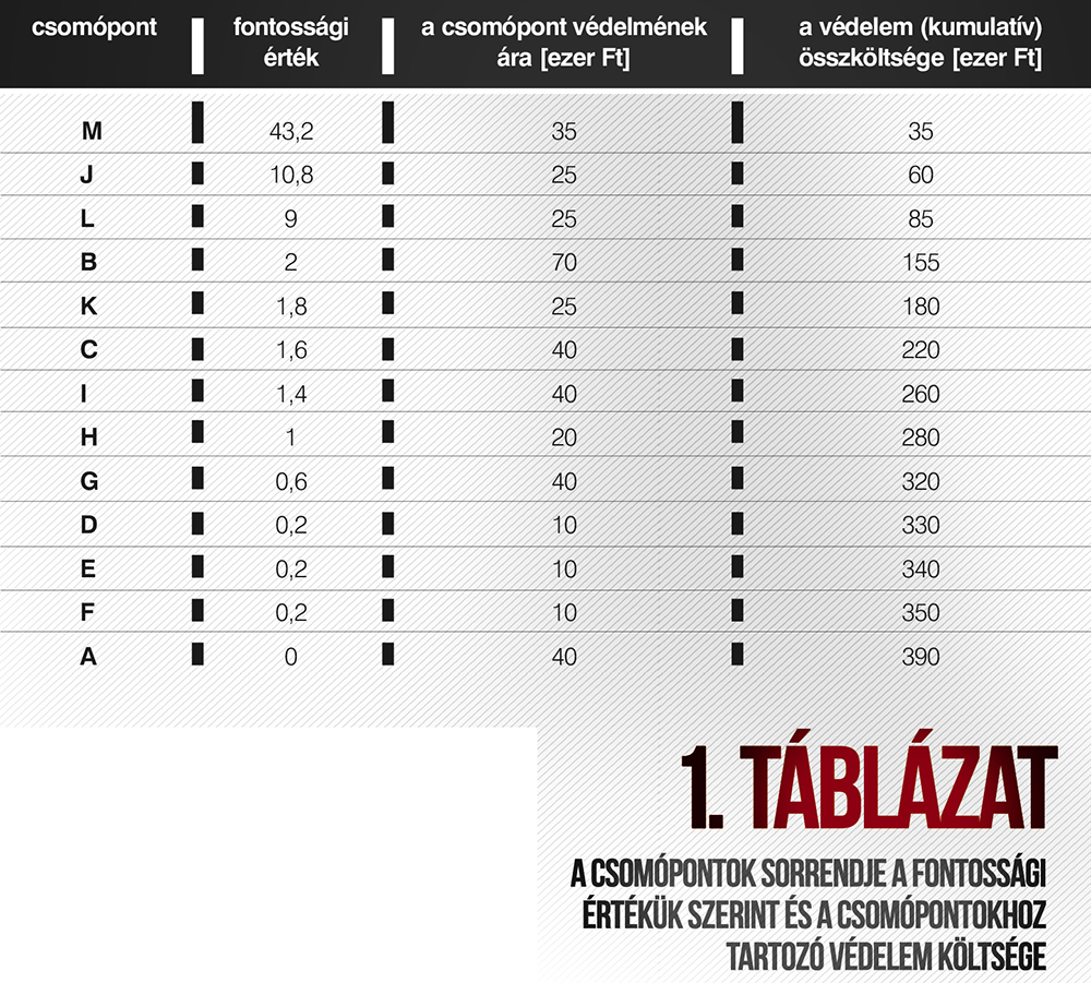 Eközben csupán azt az egy feltételt kell elfogadnia, hogy minden olyan csomópont védelméről gondoskodik, melynek fontossági értéke nagyobb, mint az általa tetszőlegesen (de nyilván gazdasági szempontok alapján) kiválasztott határérték.
