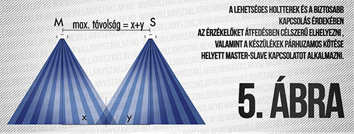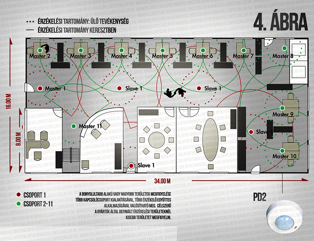 A bonyolultabb alakú vagy nagyobb területek megfigyelése több kapcsolócsoport kialakításával, több érzékelő együttes alkalmazásával valósítható meg (4. ábra). Célszerű a gyártók által definiált érzékelési területeknél kisebb területet megfigyelni. A lehetséges holtterek és a biztosabb kapcsolás érdekében az érzékelőket átfedésben célszerű elhelyezni (5. ábra), valamint a készülékek párhuzamos kötése helyett Master-Slave kapcsolatot alkalmazni.
