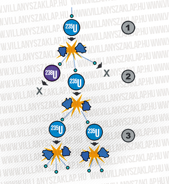 Az atomreaktor a nukleáris erőmű központi berendezése, amelyben a hőt maghasadás termeli. Ellentétben a hagyományos fűtőanya- gokkal (szén, olaj, gáz stb.), amelyek energiájukat kémiai folyamatban (oxidáció) szabadítják fel, a nukleáris energiatermelés fizikai magreakció eredménye. A reakció úgy zajlik, hogy a hasadó- képes urán-235 izotóp atommagja befog egy lassú (termikus) neutront, majd két kisebb magra bomlik. Eközben felszabadul 1-3 gyors neutron is. Így a maghasadás több neutront kelt, mint amennyit elhasznál, és az egész folyamat önfenntartó lesz. Ezt nevezik láncreakciónak (2. ábra).
