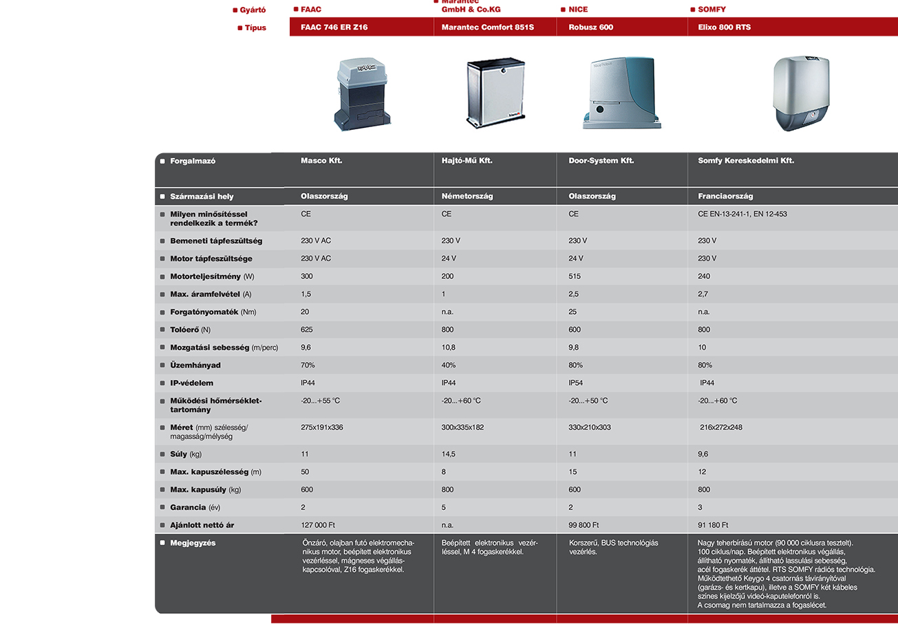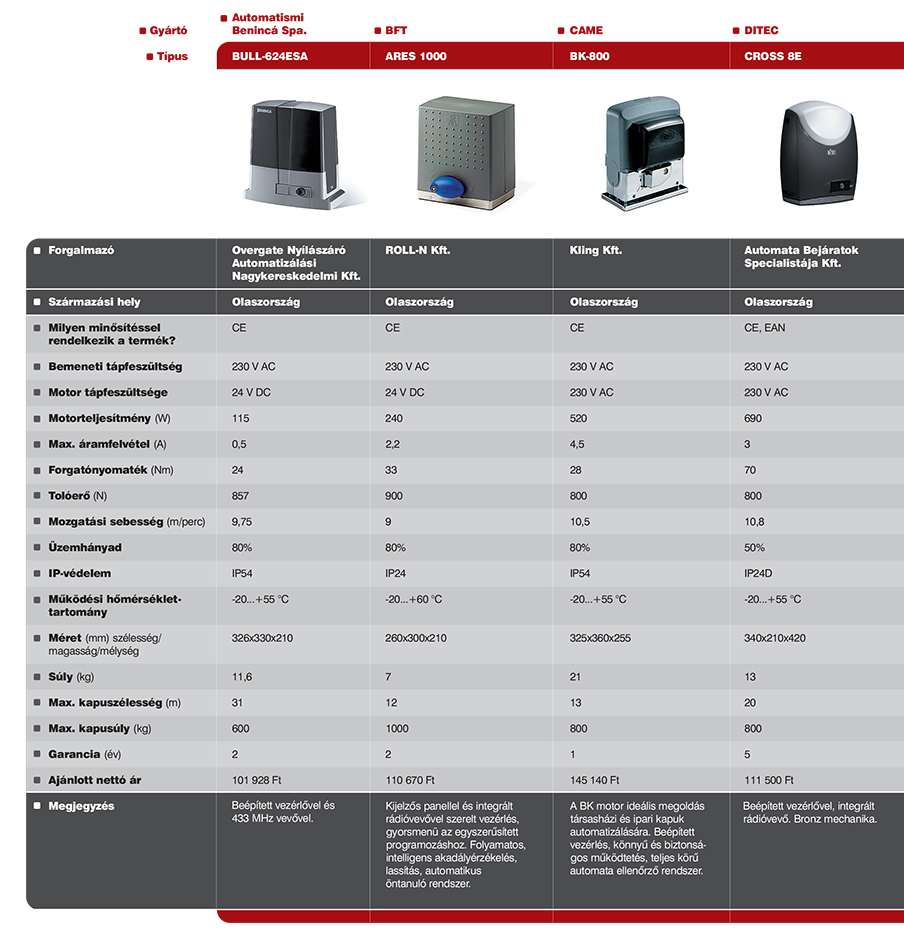 Max. 800 kg-os kapu mozgatásra alkalmas, elektromechanikus tolókapu-mozgató motorok