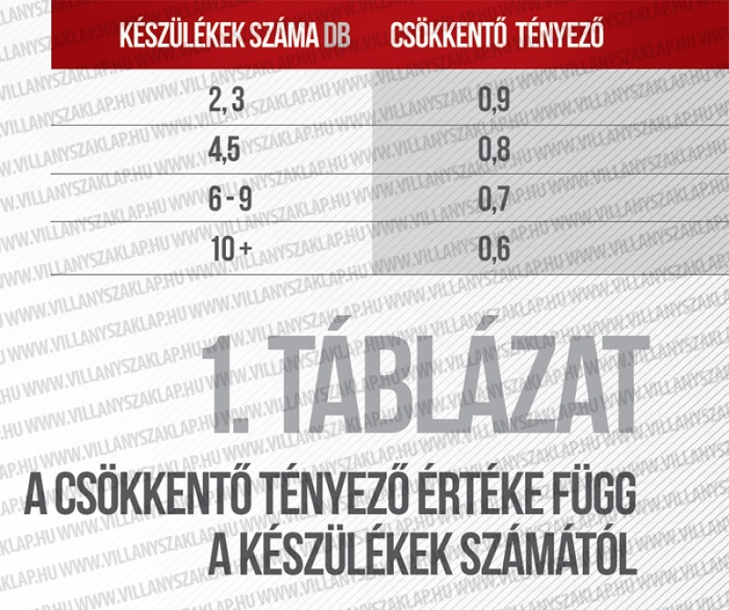 Még egy fogalmat érdemes megemlíteni – mielőtt a konstrukciós ellenőrzés főbb lépéseire áttérnénk – az RDF-et (Rated Diversity Factor), mint csökkentési tényezőt. Általában a gyűjtősínre csatlakozott készülék terhelése nem egyforma. Emiatt nem szükséges gyűjtősín méretezésnél az összes készülék (névleges áramainak összegét) folyamatos működését figyelembe venni (1. táblázat.)
