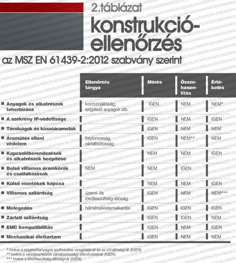 A következőkben ismertetjük, hogy a szabvány követelményei szerint hogyan kell a berendezés ellenőrzését elvégezni. A konstrukciós ellenőrzésen belül nem kell elvégezni azokat a vizsgálatokat, amelyek kihatással vannak a berendezés működőképességére (pl. zárlatbiztossági ellenőrzés), abban az esetben, ha a berendezést üzembe helyezik. Kis darabszámú illetve egyedi rendeléseknél van ennek jelentősége. A 2. táblázatban megtekinthetők a konstrukciós ellenőrzés főbb lépései, ezen belül, hogy adott vizsgálatnál, így például a szekrények IP védettségénél milyen ellenőrzési metódus alkalmazható.