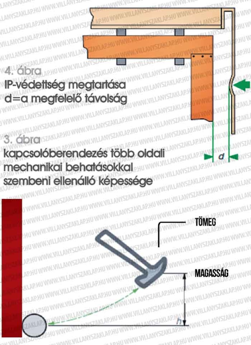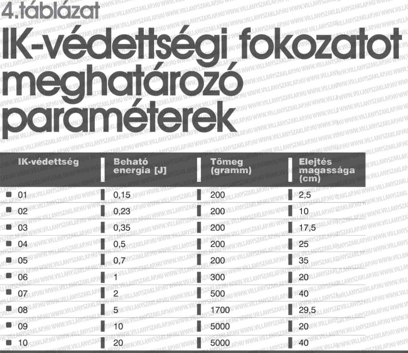 Röviden az IK-védettségről, az MSZ EN 62262:1998 szabvány határozza meg a villamos berendezések burkolatai által nyújtott védettségi fokozatot, amely megadja a külső mechanikai hatásokkal szembeni ellenállóságot (3. ábra). Minden szám a behatás energiájára utal (Joule-ban), amit a tárgy el tud viselni (4. táblázat).