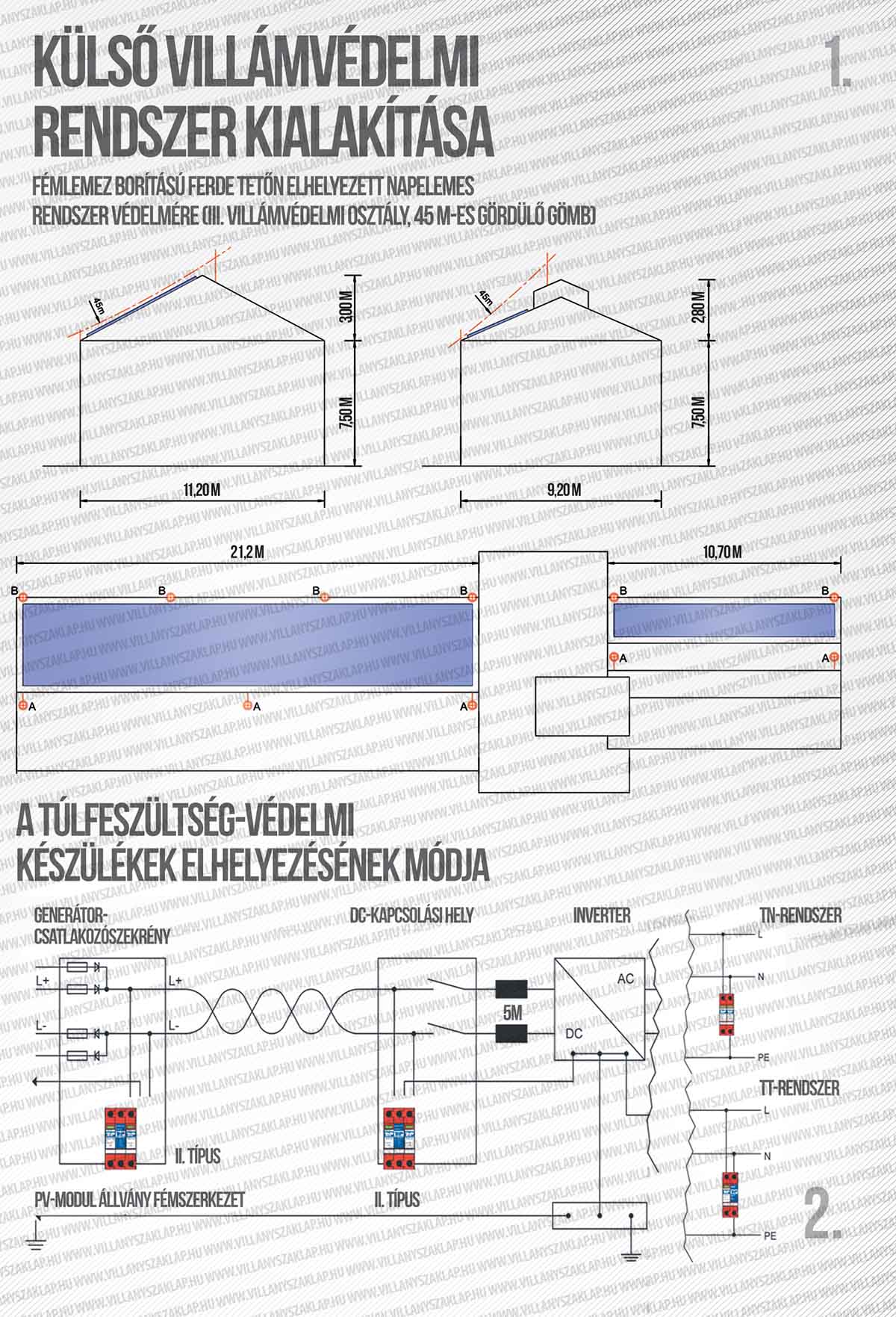 Túlfeszültség-védelem kialakítása (LPMS): A szabvány egy kiválasztó ábrát tartalmaz, amelyből egyszerűen kiolvasható a szükséges LPS és LPMS fokozat. Fontos megjegyezni: - A túlfeszültség-védelem csak lokálisan hatásos. - A 1+2 tip. levezető alkalmazása a külső villámvédelmi rendszert nem tudja helyettesíteni. - A DC oldali levezetők méretezési feszültségét a PV-generátor maximális üresjárati feszültségéhez kell igazítani (600, 800, 1000 V). - Az inverterek gyárilag beépített AC oldali túlfeszültség-védelme nem alkalmas az AC oldali hálózat felül érkező légköri eredetű túlfeszültségek levezetésére.