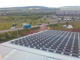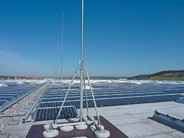A második fotón a napelemeket a biztonsági távolság betartásával telepített, szabadon álló felfogó oszlopokkal védik meg az esetleges villámcsapásoktól. A szabadon álló felfogók és tartószerkezeteik V2A minőségű rozsdamentes acélból készülnek, amely garanciát jelent a korlátlan használati időtartamra, a maximális korrózióállóságra, valamint a kimagasló mechanikai tulajdonságokra. |