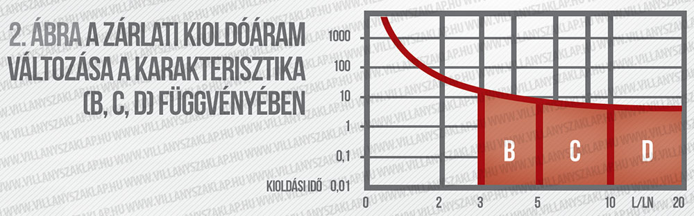 Már el is jutottunk a védelmi eszközig. Ahhoz, hogy a védelmi eszköz működésbe lépjen meghatározott nagyságú áramra van szüksége. Az, hogy mekkora az az áram, amelynél a megfelelő időn belül old, az a szerkezeti kialakítástól függ. Ez látszik a védelmi eszköz kioldási karakterisztikájából, amely logaritmikus táblázat segítségével azt mutatja meg, hogy az adott eszköz mennyi idő alatt old annak függvényében, hogy a névleges áram hányszorosa folyik rajta. Nézzük meg a kismegszakító kioldási jelleggörbét bemutató egyszerűsített ábrát (1. ábra), látszik, hogy 0,4 másodperces kioldási időhöz a névleges áramnak minimum az ötszöröse kell, hogy folyjon, de lehet, hogy a tízszeresére is szükség van (kék vonal). A különbség (szórás) egy adott típusú, névleges áramú és kioldási karakterisztikájú kismegszakítók esetén a gyártási technológiából ered, nem lehet ugyanis két pontosan ugyanolyan kismegszakított gyártani. Vagyis ha ezen ábra szerint biztosra akarunk menni, akkor az azt jelenti, hogy 0,4 másodperces kioldási időhöz, mondjuk 10 A névleges áram esetén, a szerkezeten minimum 100 ampernek kell folynia. Van olyan gyártó, amely kismegszakítók esetén B karakterisztika esetén eleve 3-5, C karakterisztika esetén 5-10, D karakterisztika esetén 10-20 I/In aránnyal számol. (2. ábra).