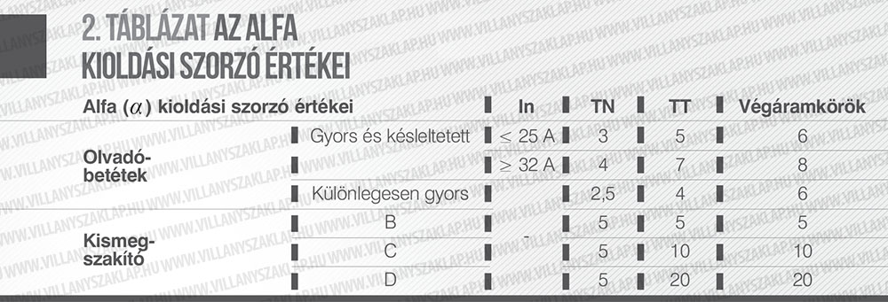 Azonban, hogy ne kelljen karakterisztikákat nézegetni, kitalálták az alfa (α) kioldási szorzót. Ez egy szám, ami megadja a kapcsolatot a kioldóáram (Ia) és a névleges áramerősség (In) között. A 2. táblázat segítségével meghatározhatjuk az alfa kioldási szorzót a névleges áramerősség, a villamos rendszer (TN, TT), biztosító típusa és karakterisztikája és az áramkör jellege alapján. Az alfa kioldási szorzó használatát a szabványok nem tiltják. Nézzünk itt is pár példát. Végáramkör, C16-os kismegszakító, TN-rendszer: alfa kioldási szorzó értéke 10, vagyis 0,4 másodperc alatti kioldáshoz 160 A-nek kell tudnia folynia. (Már magyarosan fogalmazunk…)