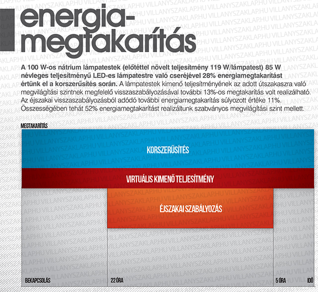 Palóczy út: A 100 W-os nátrium lámpatestek (előtéttel növelt teljesítmény 119 W/ lámpatest) 85 W névleges teljesítményű LED-es lámpatestre való cseréjével 28% energiamegtakarítást értünk el a korszerűsítés során. A lámpatestek kimenő teljesítményének az adott útszakaszra való megvilágítási szintnek megfelelő visszaszabályozásával további 13%-os megtakarítás volt realizálható. Az éjszakai visszaszabályozásból adódó további energiamegtakarítás súlyozott értéke 11%. Összességében tehát 52% energiamegtakarítást realizáltunk szabványos megvilágítási szint mellett (1. ábra).