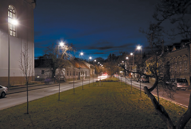A Palóczy úton a tervek szerint 10 m-es fénypontmagasságú oszlopok és 85 W névleges teljesítményű LED-es lámpatestek, a gyalogátkelőhely és a két útkereszteződés kiemelésére 115 W névleges teljesítményű lámpatest kerültek betervezésre (3. kép). A Szemere kertben a parkvilágítás céljára 36 W névleges teljesítményű parkvilágító lámpatesteket terveztünk 4 m-es acél-oszlopokkal (4. kép). A lámpatestek vezérlését biztosító központi vezérlő egység a Szemere kertben elhelyezett új közvilágítási szekrényben került elhelyezésre.