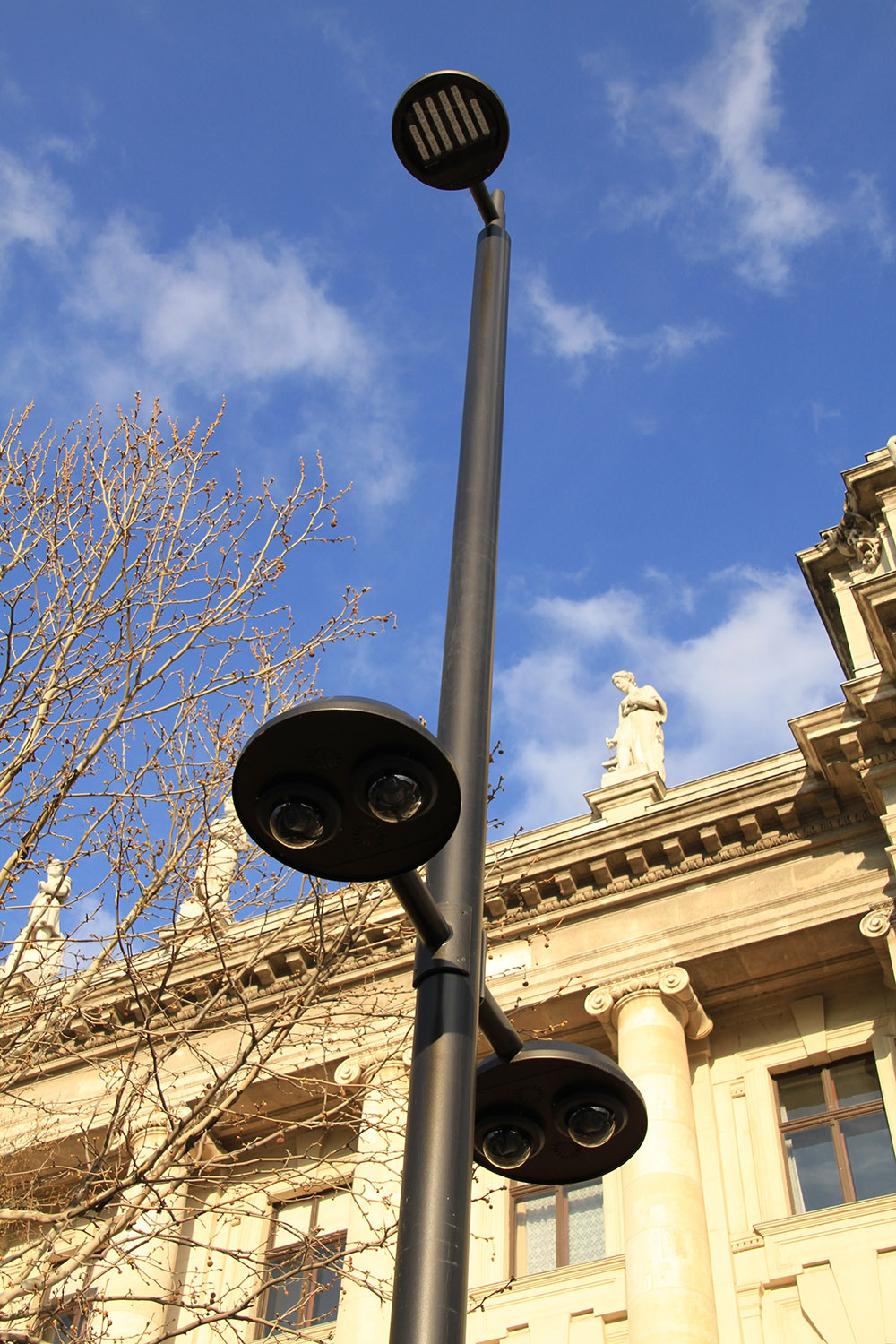 A kamerák azonban nemcsak sétányvilágítási oszlopokra kerültek, számtalan közvilágítási oszlopra is felszerelték őket, ez esetben a palacsintasütő benyomást keltő közvilágítási lámpatestekkel összhangban kialakított tartókban helyezték el őket. Néhány közvilágítási oszlop díszvilágítási fényvetőt is tart majd, ezekre felszerelték a fényvetőtartó karokat is.